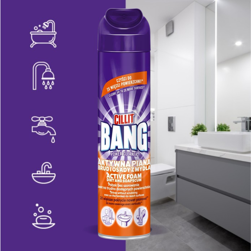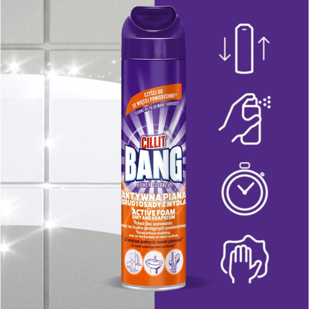 Pianka czyszcząca Cillit Bang skutecznie usuwa nagromadzone osady z mydła, kamień i zabrudzenia łazienkowe. Idealna do stosowania na pionowych powierzchniach, takich jak kabiny prysznicowe, fugi i płytki.