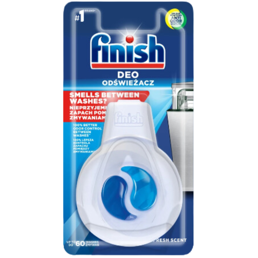 Pomiędzy zmywaniami resztki jedzenia mogą gromadzić się w zmywarce, powodując nieprzyjemny zapach. Dzięki technologii Anti-Odor Finish Odświeżacz do zmywarki zapewnia skuteczną kontrolę zapachu, dając dwa razy lepsze odświeżanie wnętrza zmywarki w porównaniu do użycia samego detergentu. Zapach utrzymuje się nawet do 60 zmywań, pozostawiając wnętrze zmywarki przyjemnie pachnące.